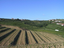 terrassierte Neuanlagen bei Zegla an der slovenischen Grenze, im Hintergrund Mitte bereits in Produktion stehende Hänge mit Pinot Grigio